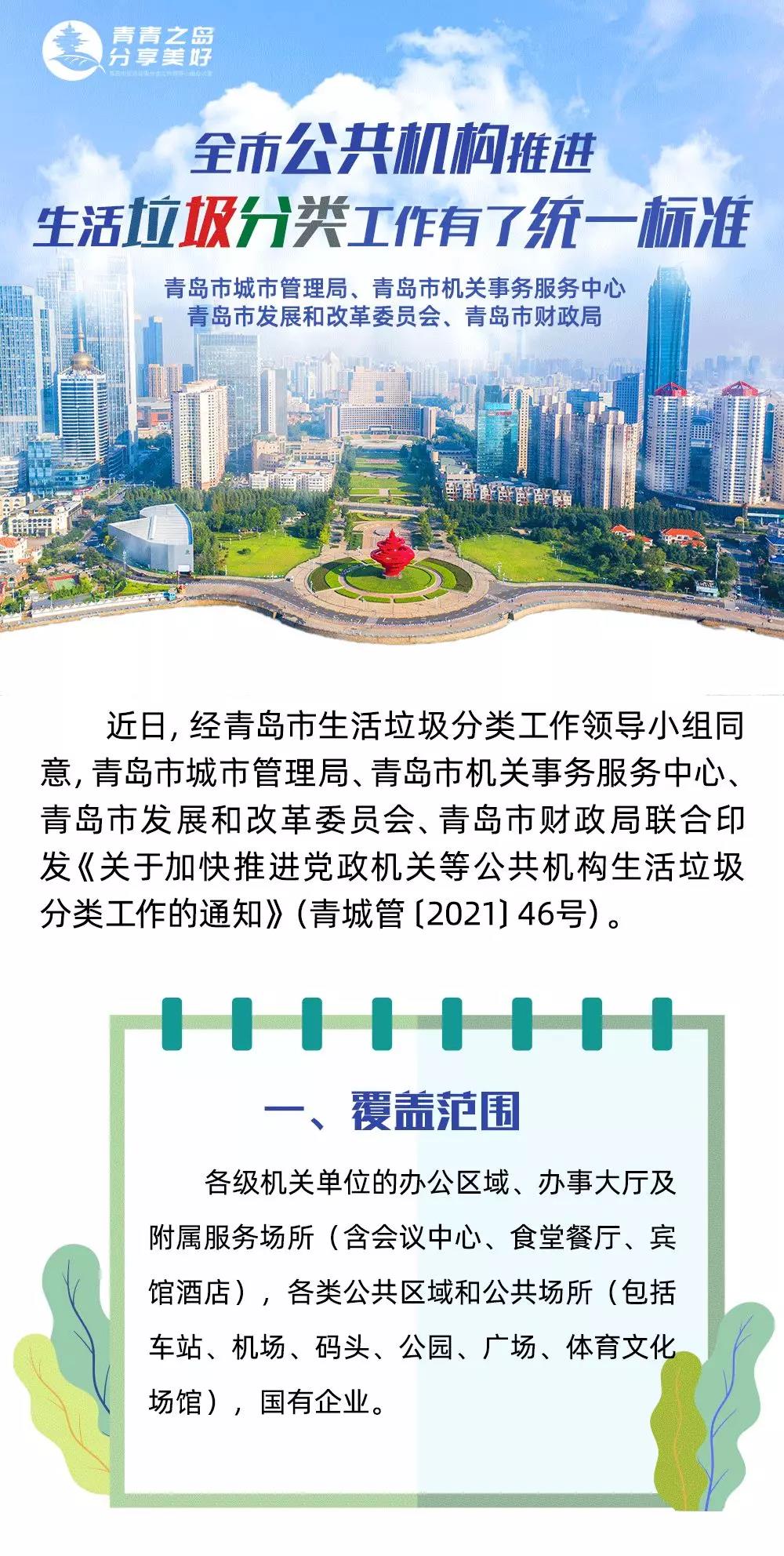 《通知》在全面落實國管局要求的基礎上,結合我市實際,增加了具有青島特色的工作內容。如:要求國有企業參照公共機構標準推進生活垃圾分類工作,選定11個市屬國有企業代表作為第一批生活垃圾分類制度有效覆蓋單位。市財政局支持加大經費投入,對公共機構實施垃圾分類工作給予必要的政策支持和經費保障。發揮重點區域示范引領作用,在市區兩級黨政機關集中辦公區域率先實現垃圾分類的有效覆蓋。
